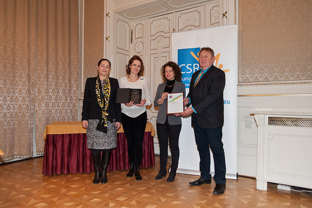 dr. Szentivány Ágnes (Joint Venture Szövetség) és dr. Mihalik Zsuzsa, valamint Schneider Balázs az AYCM SportPass vezetői/CSR Hungary Díj 2015